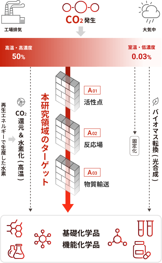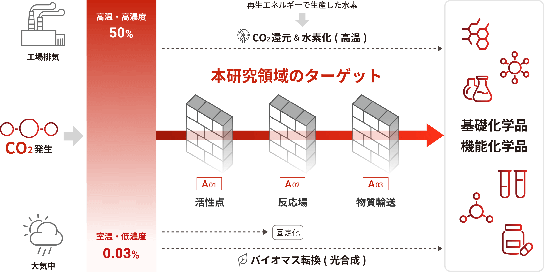 本研究では吸着材の空間にCO2変換に有効な金属触媒を内包させることで、反応駆動圧の大幅な低減を狙います。A01班とA02班との有機的連携により、これまで難しいとされてきた内包金属触媒の構造・電子状態の制御及び基質の長距離輸送機構の制御も視野に入れた革新的材料設計を目指します。