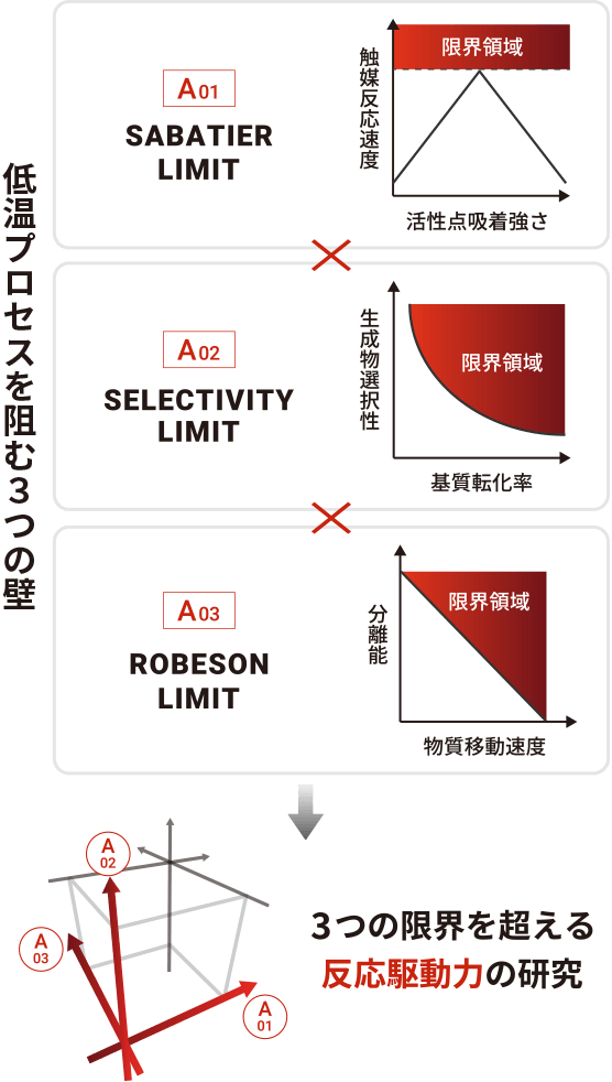 素過程同士のトレードオフに由来する反応駆動の限界は、原子ひとつからなる触媒活性点のスケール(Å)以外にも、化学反応が起こる舞台である反応場のスケール(nm)や、反応場の周囲にある物質輸送領域のスケール(µm)に至るまで複数存在し、実はSabatier限界もそのひとつです。こうした限界を超えてゆかなければ「ビヨンドゼロ」は成し遂げられません。